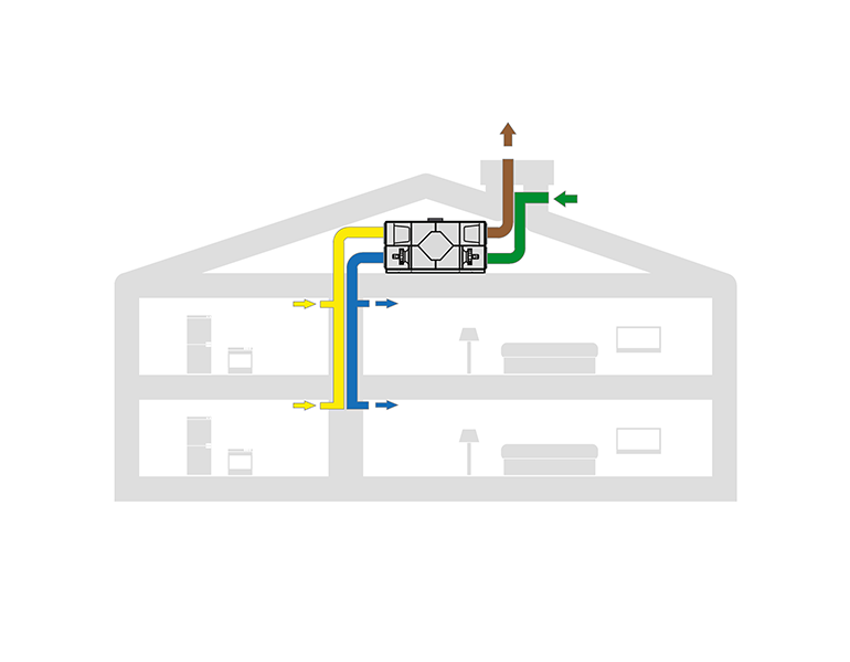A semi-centralised solution eliminates the need for extensive ducting, the advantage of which is relatively low system pressure falls, which in turn results in an energy-efficient and quiet system. Semi-centralised units can be served by a counterflow heat exchanger or a rotary heat exchanger.
