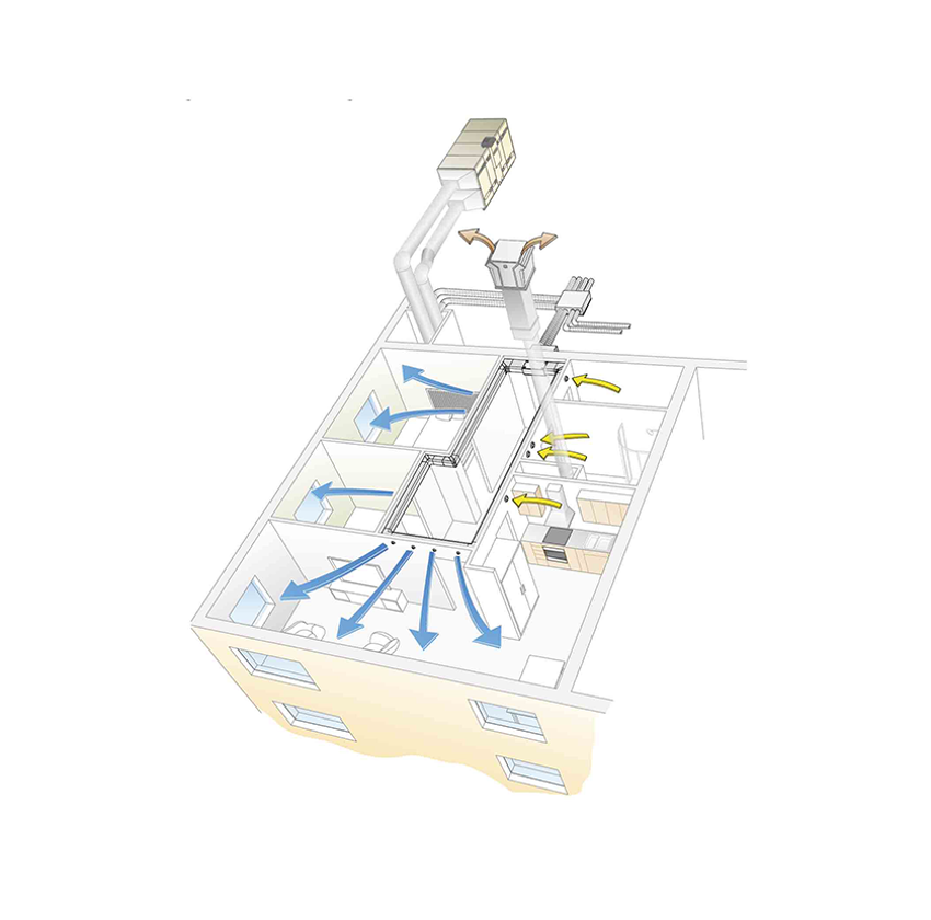 If the aim is to optimise your energy efficiency, you need to run a system that is controlled automatically by the ventilation need in each individual flat. This solution involves connecting a central ventilation unit via main ducts or a shaft to a distribution cabinet for each landing.