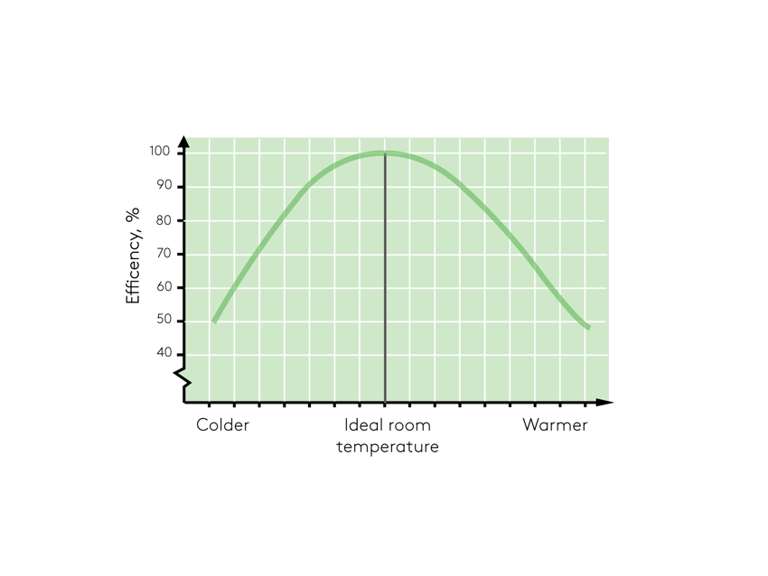 When the indoor temperature deviates from 21 degrees Celsius, performance of the people in the premises drops quickly (see graph to the left). A similar scenario is known in the context of levels of carbon dioxide (CO2) and strategic thinking. When reaching a level of 1000 ppm CO2 in the indoor air, more than doubled the concentration outdoors, the cognitive ability decreases drastically. Airborne particles is also a subject of consideration for indoor environments. This because buildings emit various sorts of small particles to which the human body has no natural defence. A controlled and optimised indoor climate allow the people in the building to be productive and well-reasoned, as well as healthy and comfortable.