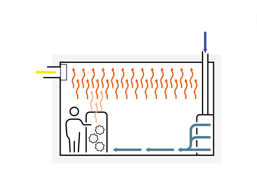 Thermally controlled ventilation, on the other hand, is suitable for industries, airports and other open plan areas. Premises with medium-high to high ceilings, limited cooling requirements and where supply air must be introduced at floor level.