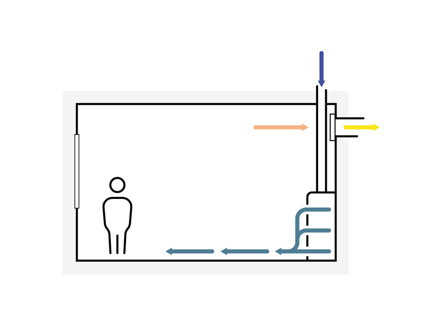 The thermally controlled ventilation is characterised by the supply air being introduced at a low speed at floor level. Supply air temperature must be lower than room temperature to make sure thermally controlled ventilation works properly. The air spread more or less across the entire floor surface and is affected by heat sources in the room. The supply air rises upwards with the warm air from heat sources and is evacuated at ceiling level.