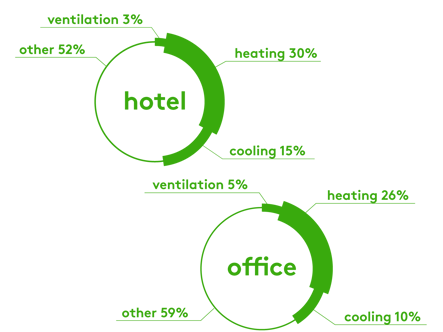 Ventilation and climate systems are major consumers of energy – related to 50% of the total energy consumption for office buildings and 70% for Hotels.