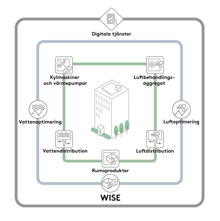 WISE jobbar lite som en hjärna i ett klimatsystem, WISE samlar in data och optimerar inomhusklimatet därefter. Med WISE är det i princip möjligt att styra all delar i ett klimatsystem, så som luftbehandlingsaggregat och klimatprodukter samt att WISE även kan styra vatten- och luftoptimering. Det finns dessutom möjlighet att lägga till digitala tjänster där produkters och fastigheters data kan visualiseras och hanteras.