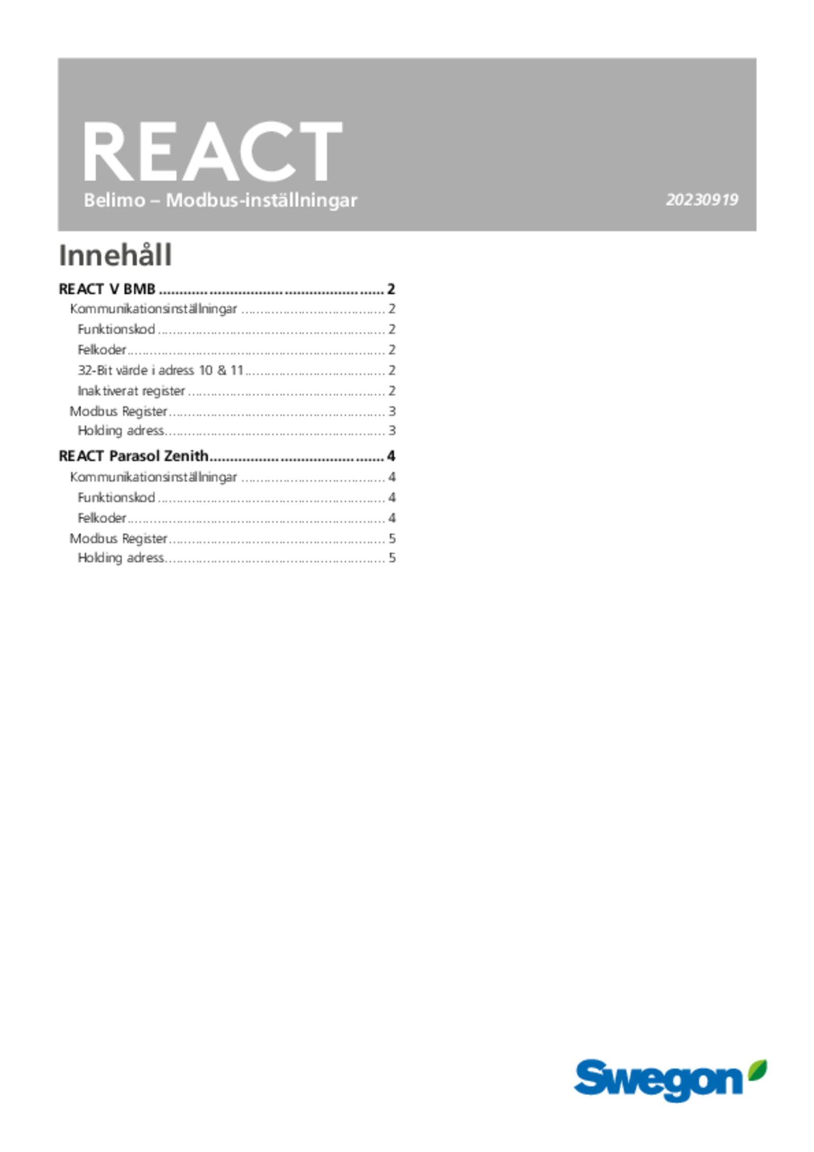 | Modbus-inställningar – Belimo (pdf 144.76kB) | REACT V BMB, REACT Parasol Zenith | IOM-manual | |
