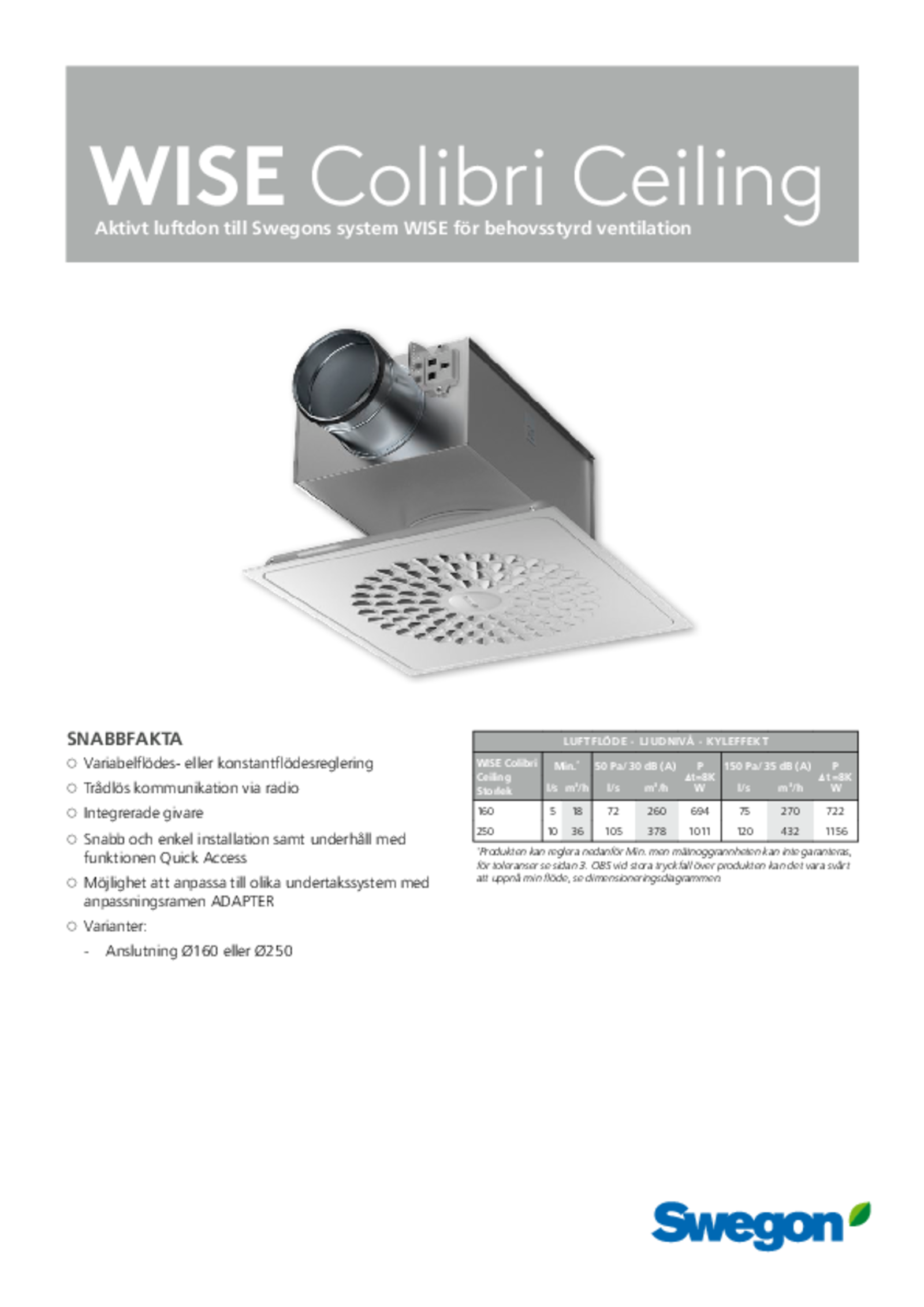 | Aktivt luftdon till Swegons system WISE för behovsstyrd ventilation (pdf 759.58kB) | WISE Colibri Ceiling a | Teknisk katalog | |