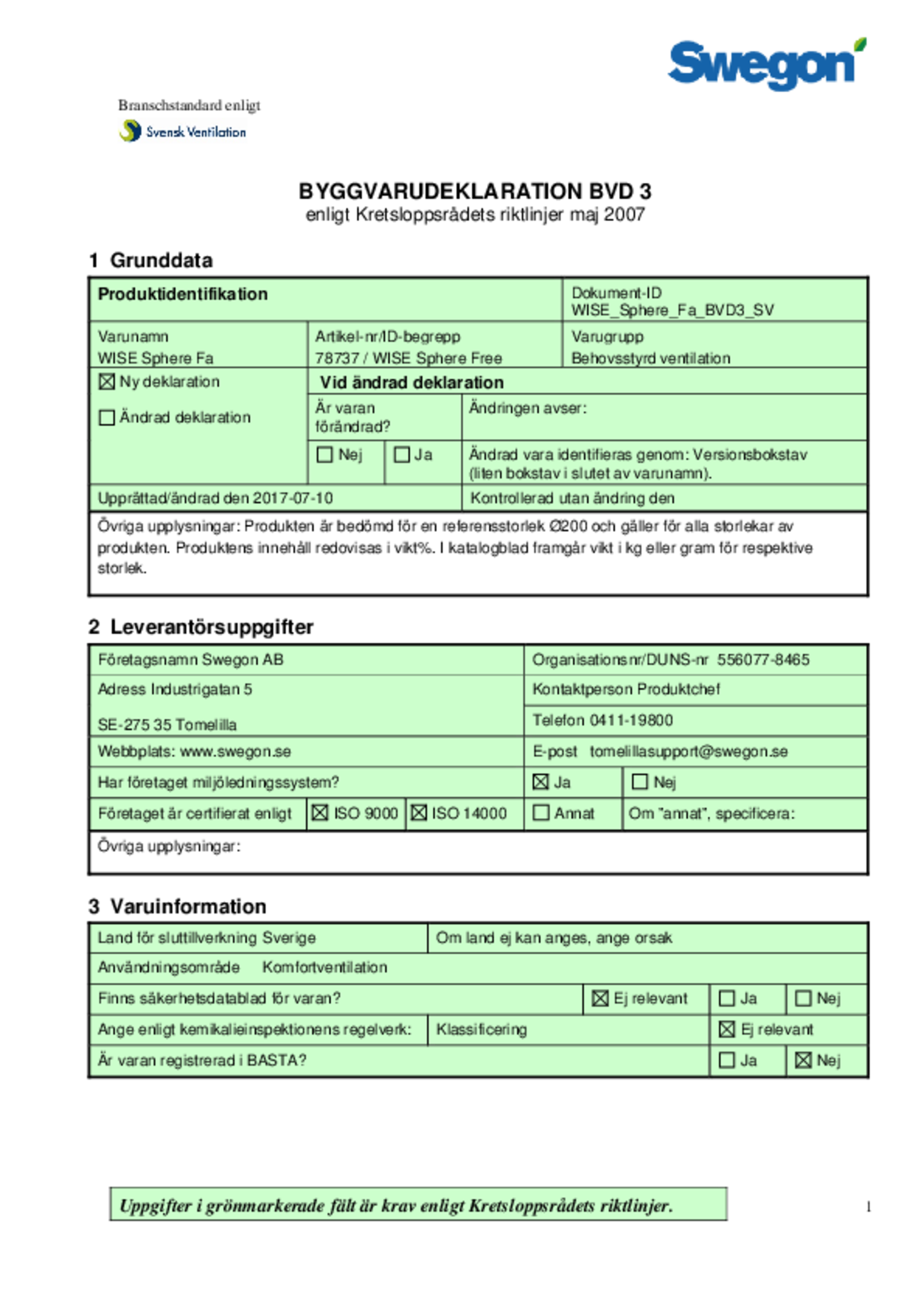 | Byggvarudeklaration (pdf 1.1MB) | WISE Sphere Free a | Kvalitetsdokument | |