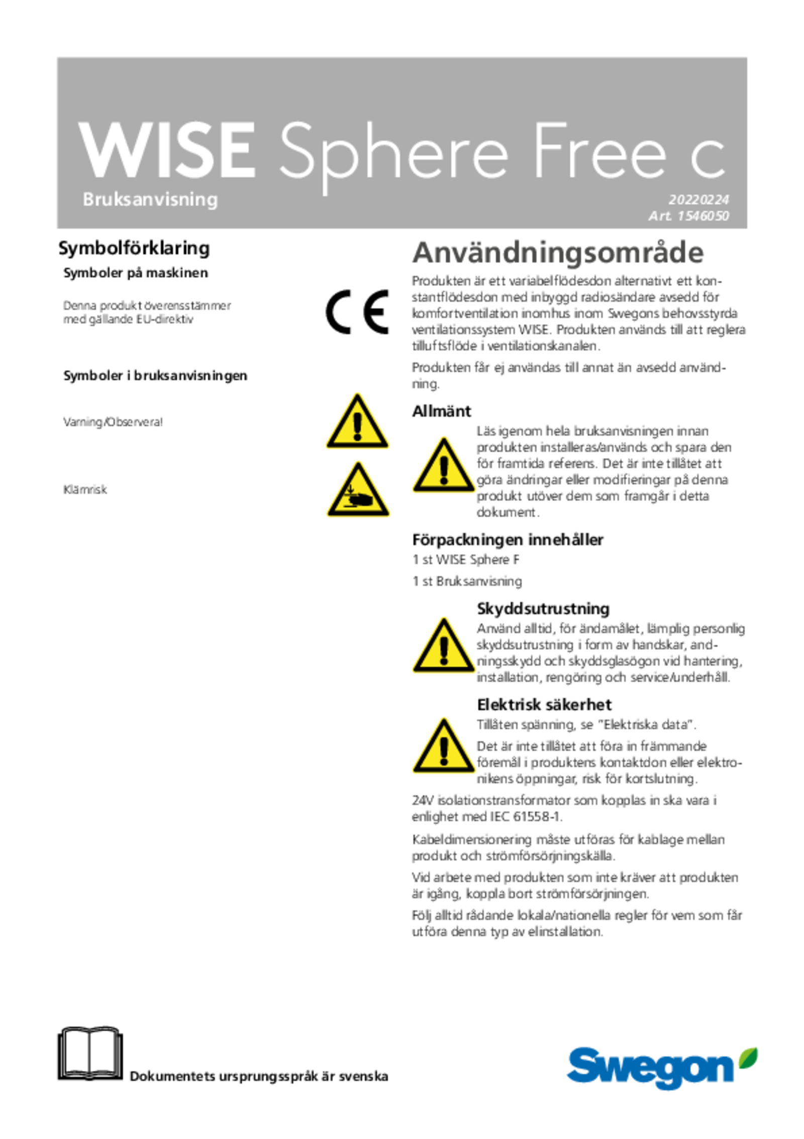 | Bruksanvisning (pdf 1.84MB) | WISE Sphere Free c | IOM-manual | |