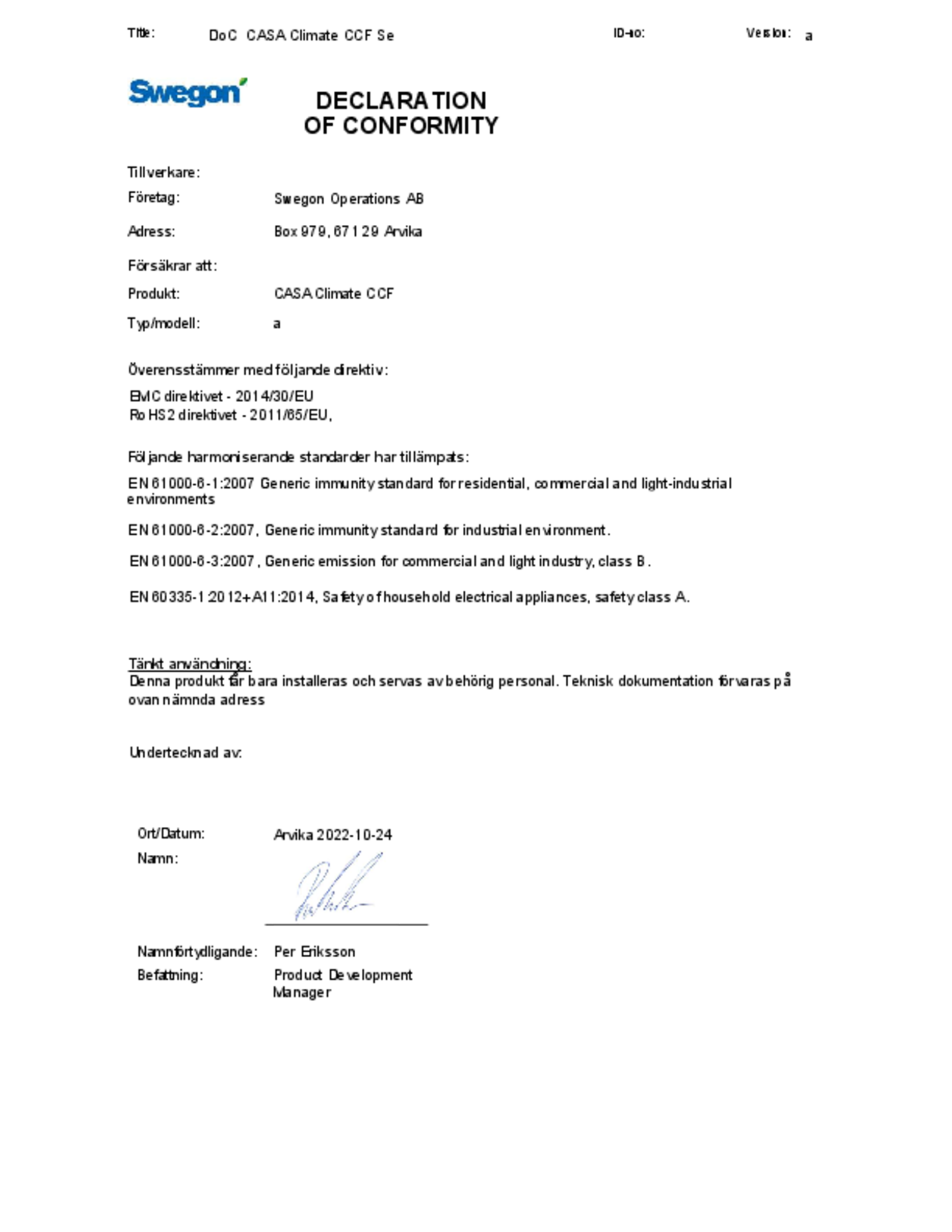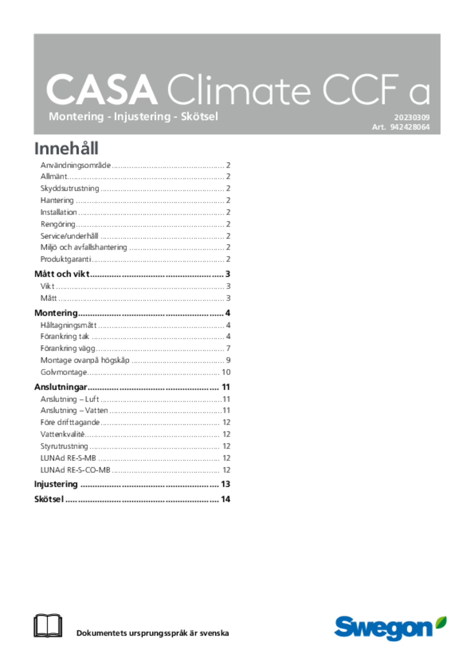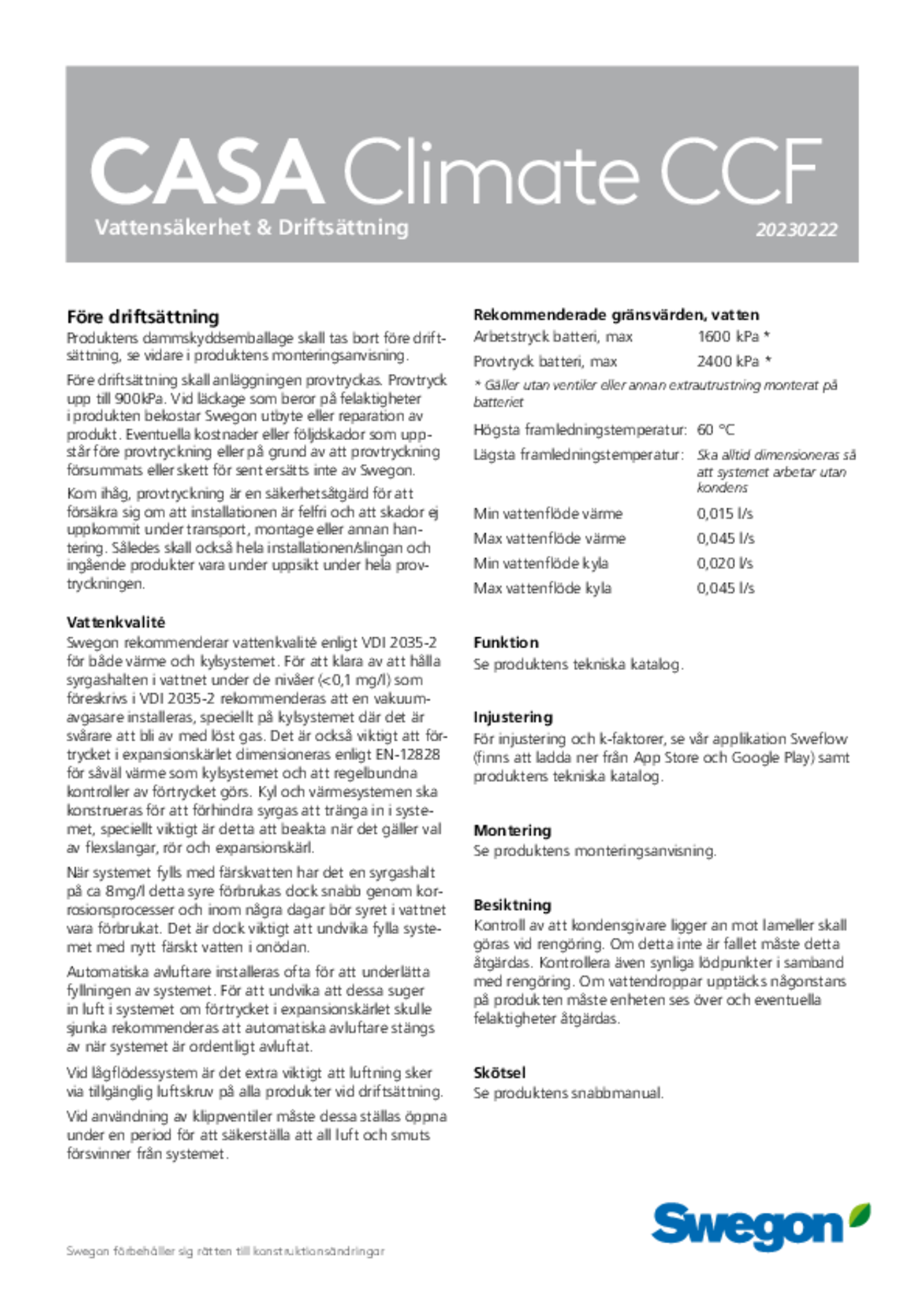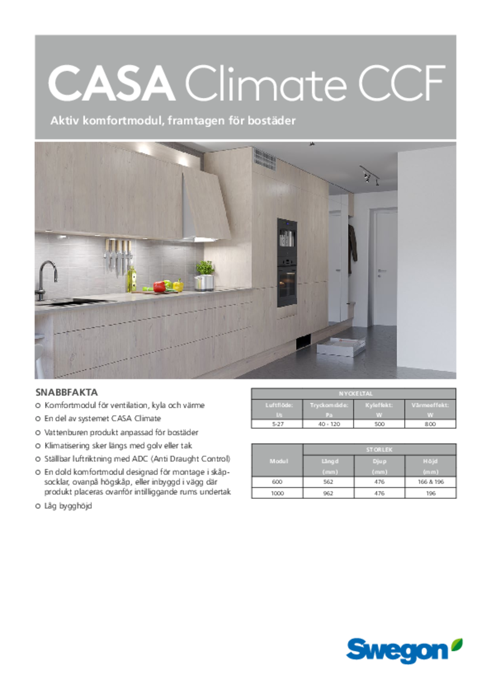 CASA CLIMATE CCF är en vattenburen komfortmodul som ansluts till lägenhetens ventilationssystem och byggnadens vattenkrets. Den tillhandahåller värme, frisk luft och eventuellt kyla till lägenheten. Beroende på behovet kan varje lägenhet ha varierande antal rumsprodukter. CCF använder sig av värme- och kylenergi från berg eller fjärrvärme/ fjärrkyla för att tillhandahålla energieffektiv klimatisering med individuell temperaturreglering för varje rum.