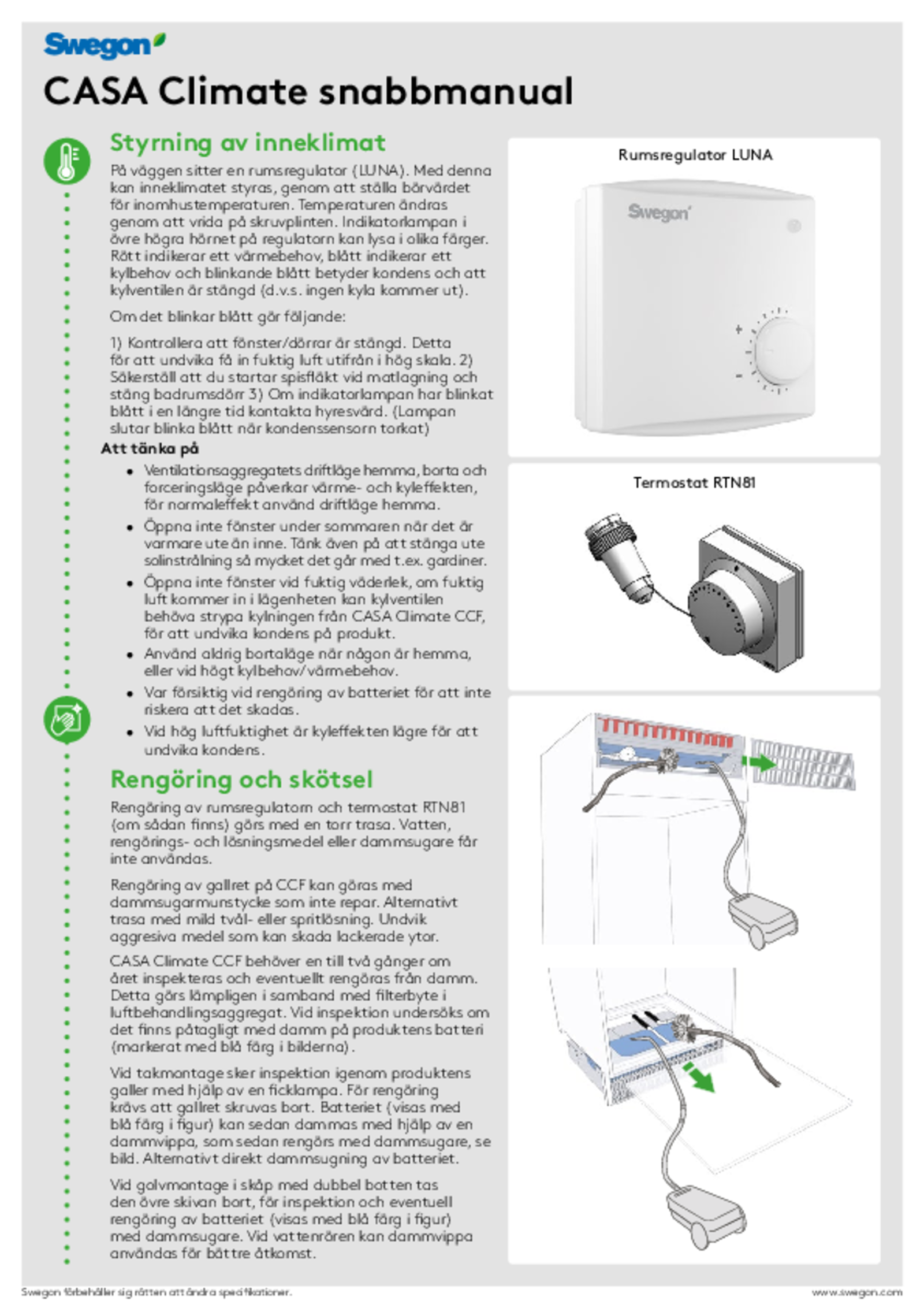 I decentrala ventilationssystem ansluts CCF till ett lägenhetsplacerat Swegon CASA ventilationsaggregat och regleras med styrsystemet CASA Genius