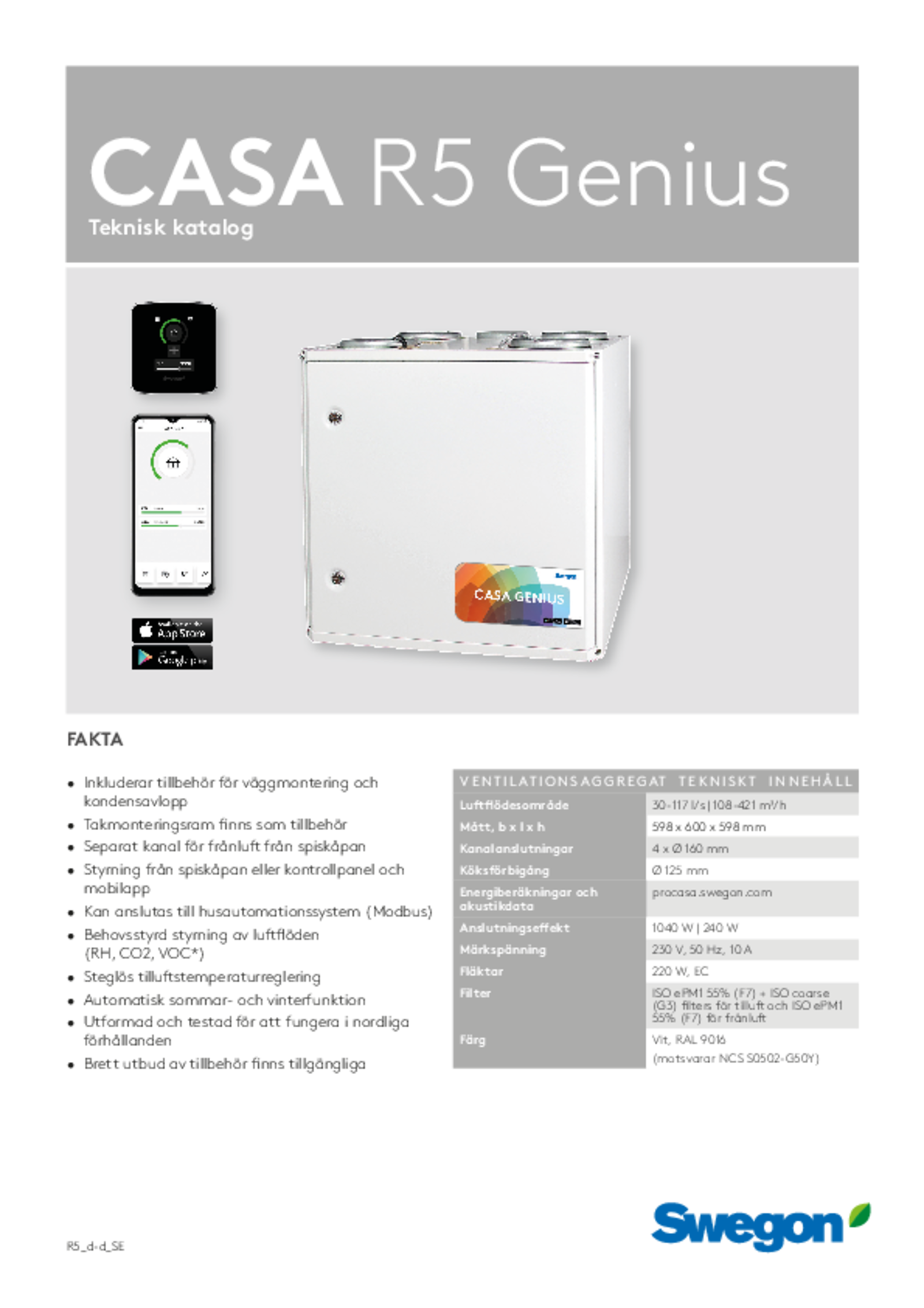 Ventilationsaggregatet styrs från spiskåpan eller kontrollpanelen och via en mobilapp (iOS/Android) och kan anslutas till fastighetsautomationssystem med Modbus.