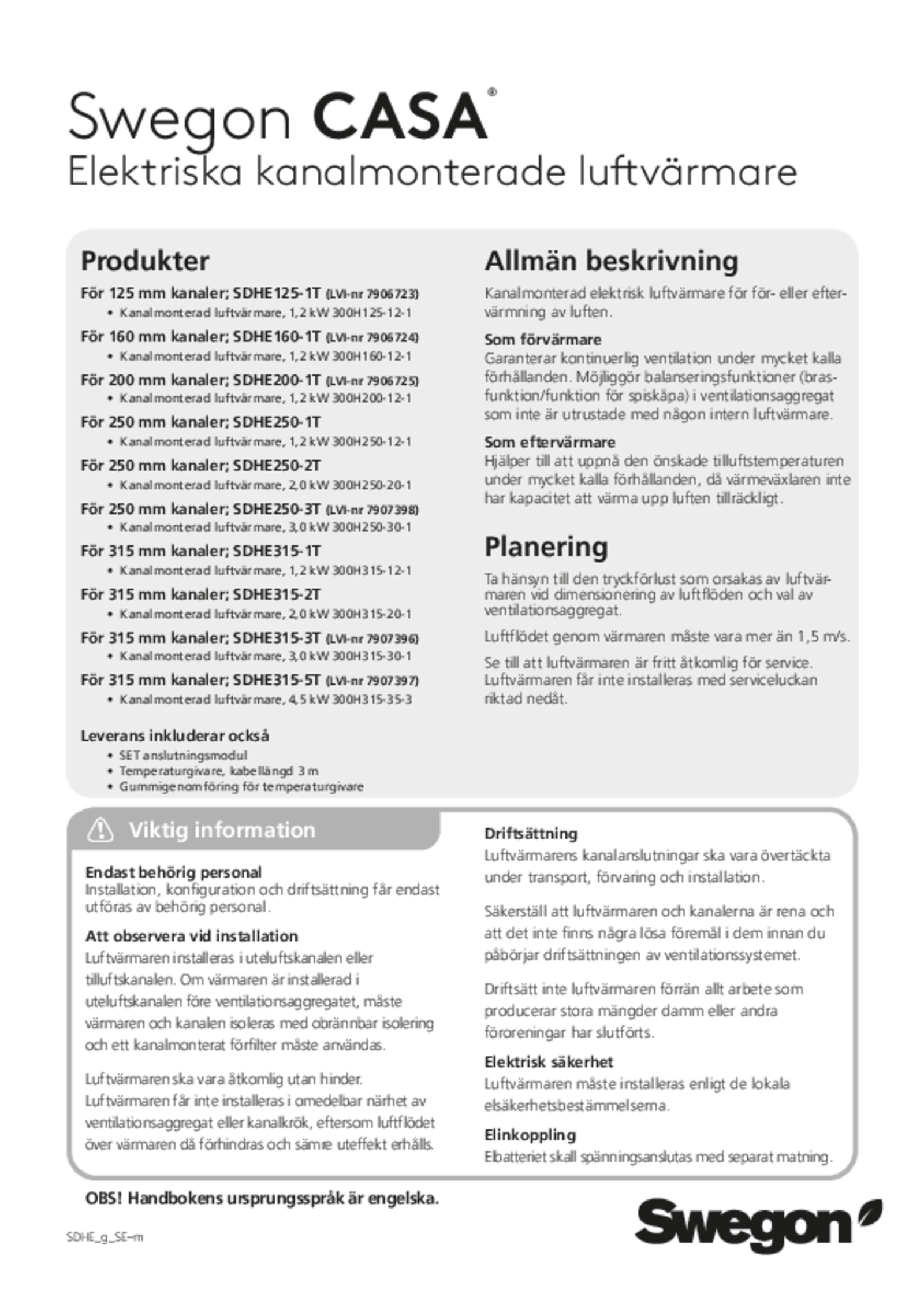 Används för förvärme Garanterar en kontinuerlig ventilation under mycket kalla förhållanden samt möjliggör balanseringsfunktioner (brasfunktion/funktion för spiskåpa) i aggregat utan inbyggd luftvärmare för förvärme. Ett FLK-filter ska installeras i kanalen framför förvärmaren.