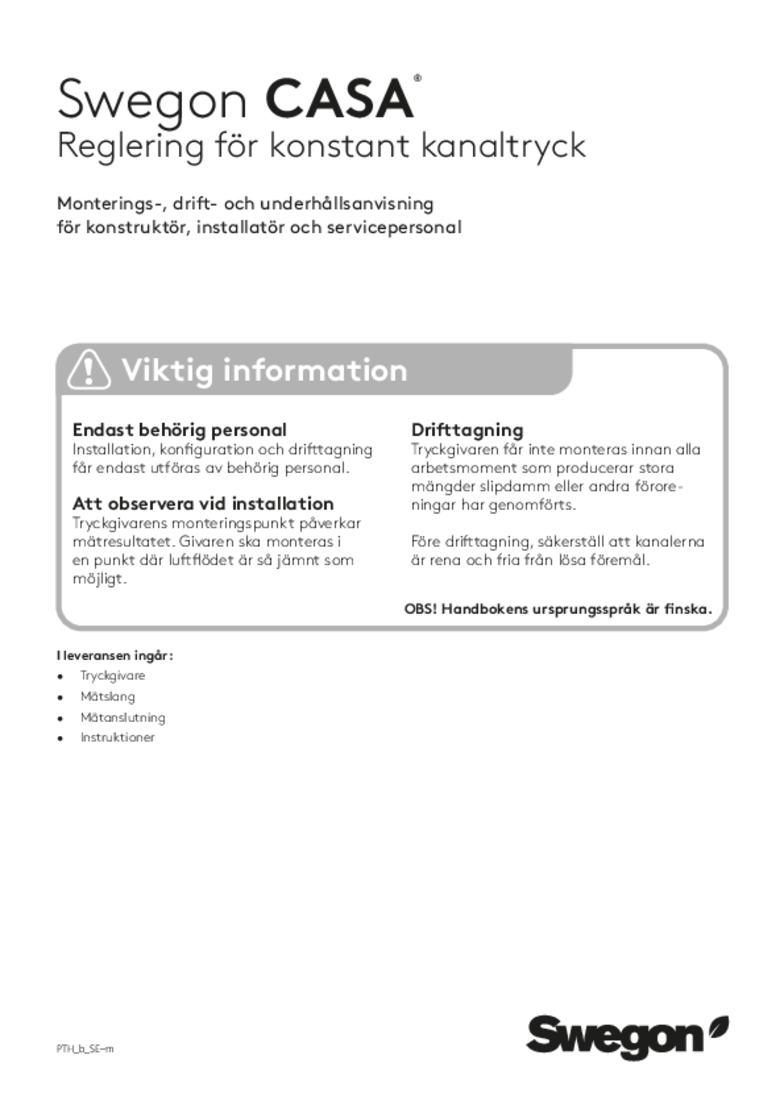 - Funktionen för konstant kanaltryck på CASA ventilationsaggregat strävar efter att genom styrning av fl äkthastigheterna hålla kanalens tryck vid inställningsvärdet.