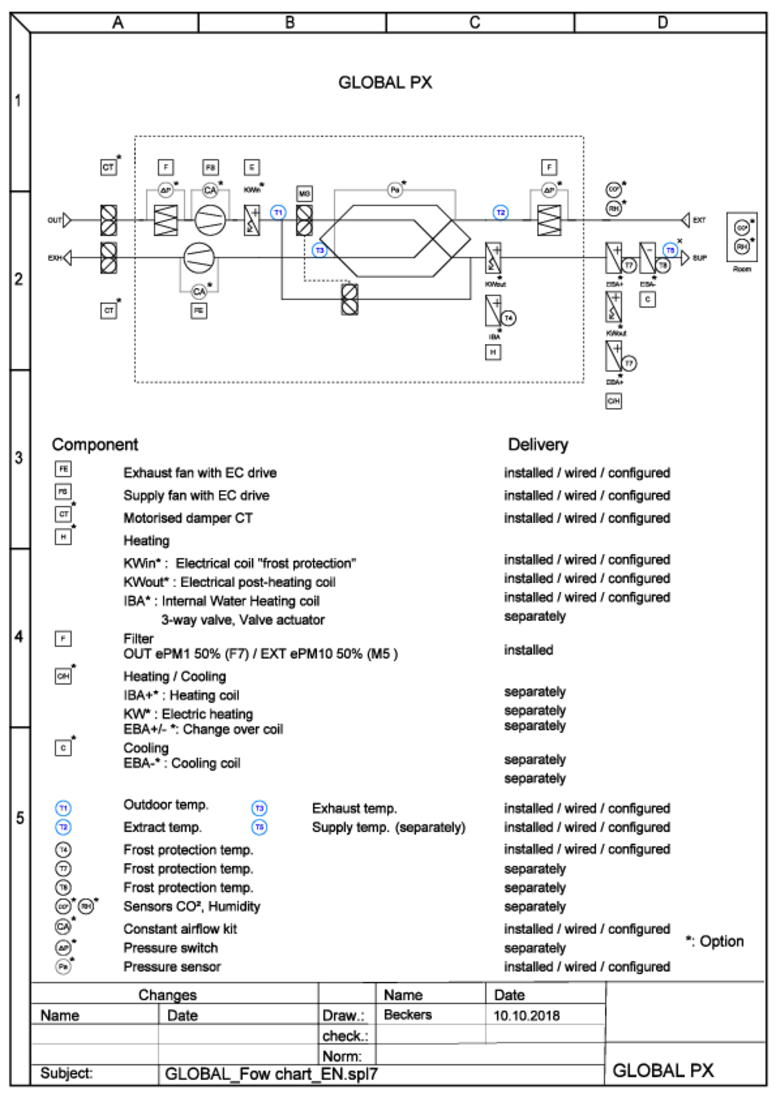 Luftbehandlingsaggregat med motströms plattvärmeväxlare och sidoanslutningar, med styrsystem.