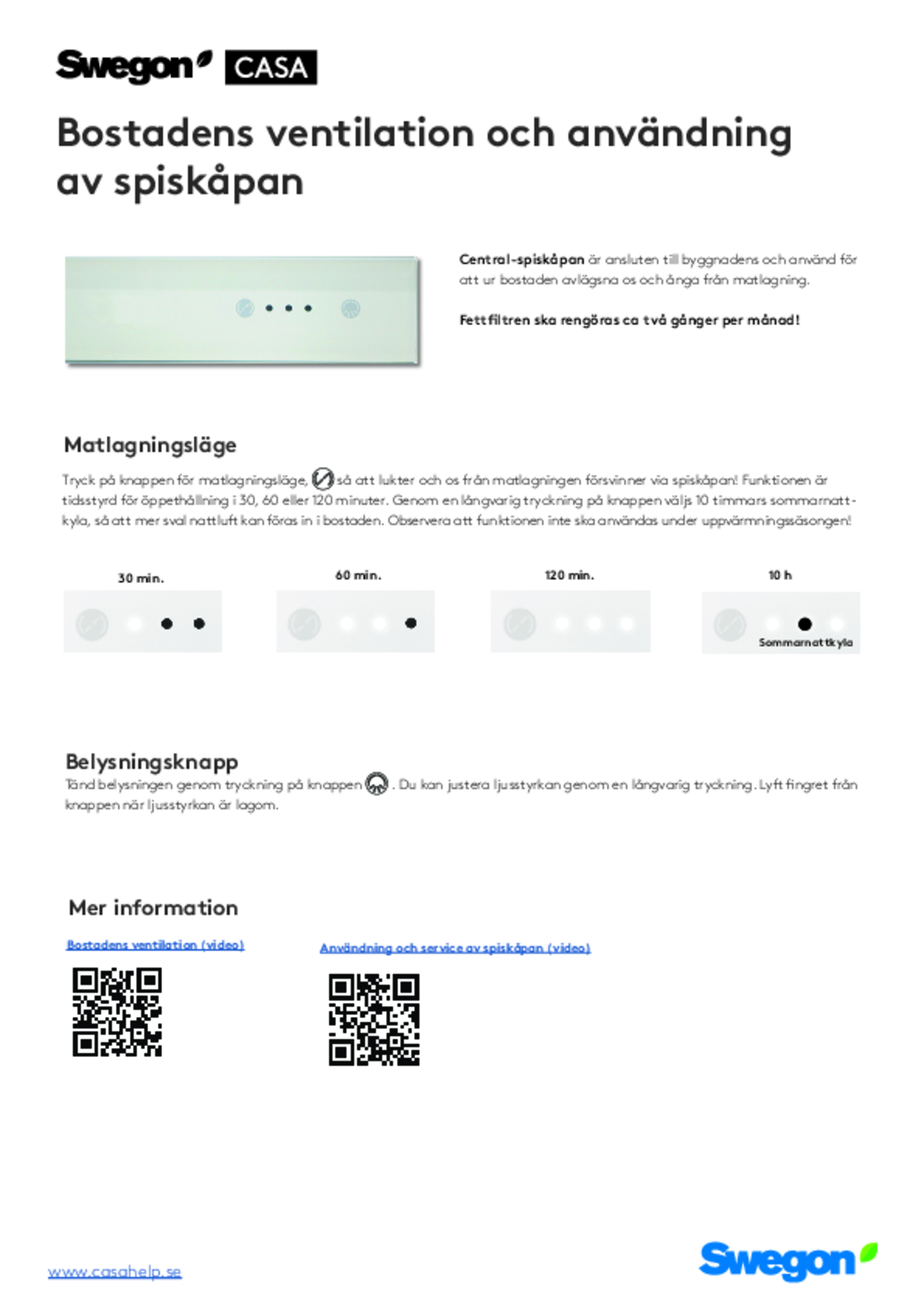 SPISVAKT - Tango kan utrustas med Safera Safety spisvakt. Spisskyddet hjälper till att skydda mot de vanliga köksolyckorna genom att förhindra att spisen lämnas utan tillsyn under användning och bryta strömmen om du glömmer att stänga av spisen. På Tango-modellerna som är utrustade med Safera är spisskyddet förinstallerat i spiskåpan. Utöver detta behövs en effektstyrenhet som är godkänd för användning (3-fas eller 1-fas). Swegon rekommenderar även installation av vattenläckagevakt (SA1)