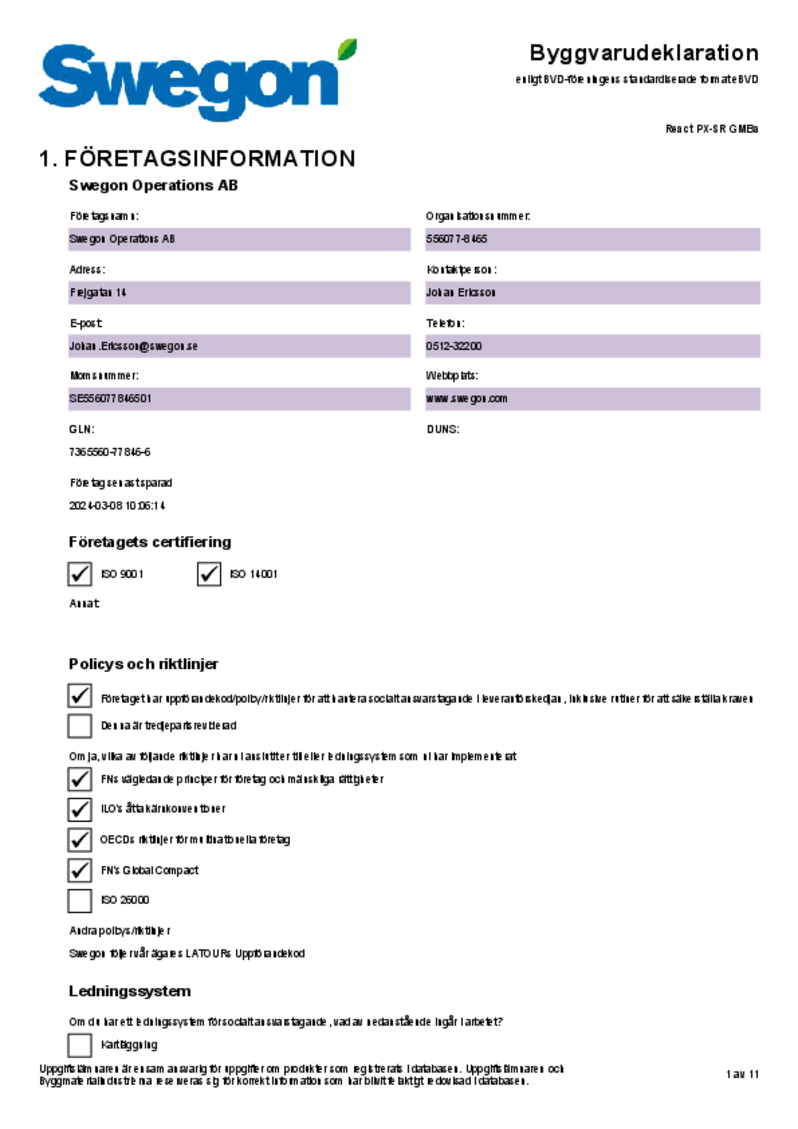 | Byggvarudeklaration (pdf 149.73kB) | REACT PX GMBa (cirkulär) | Kvalitetsdokument | |