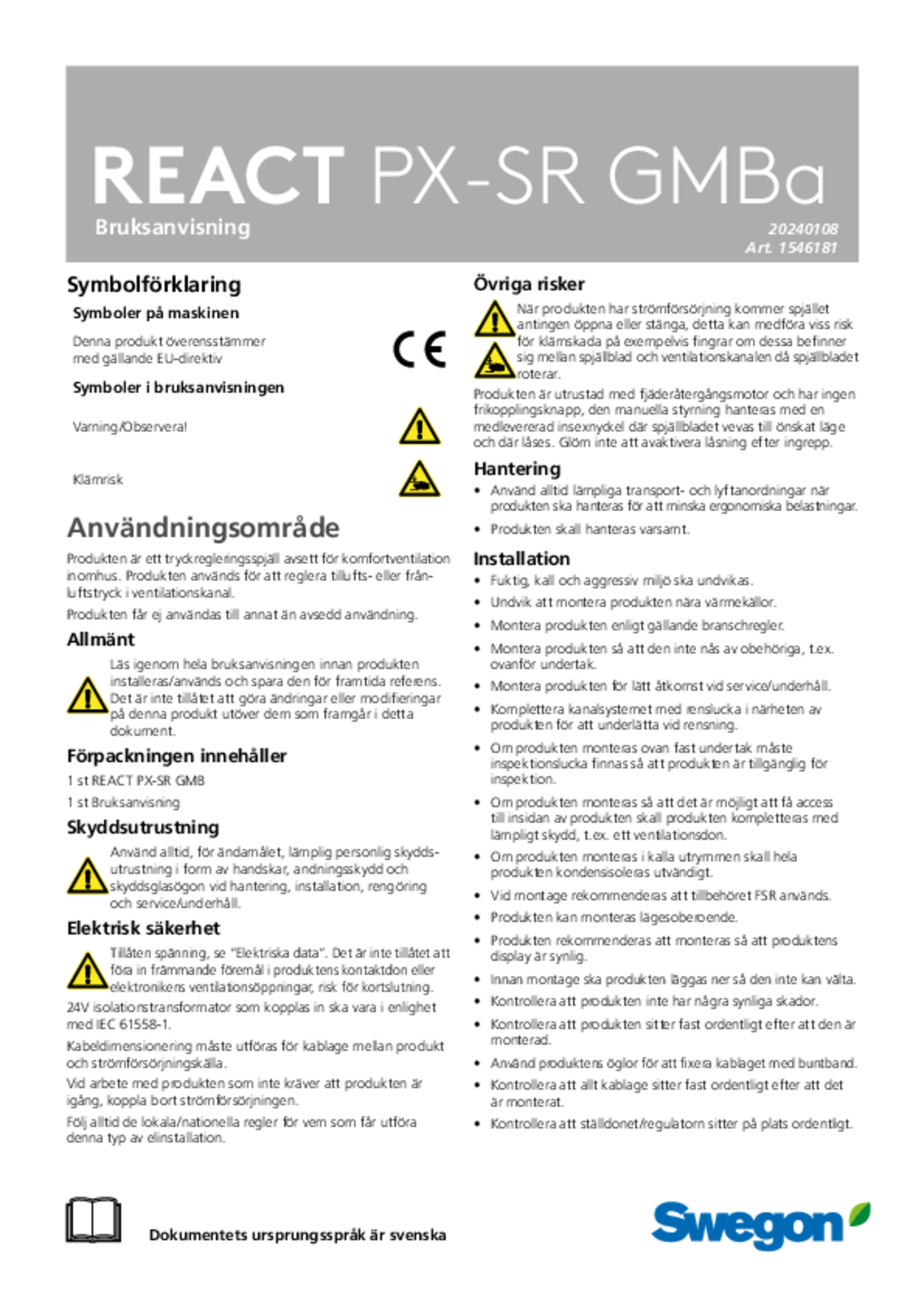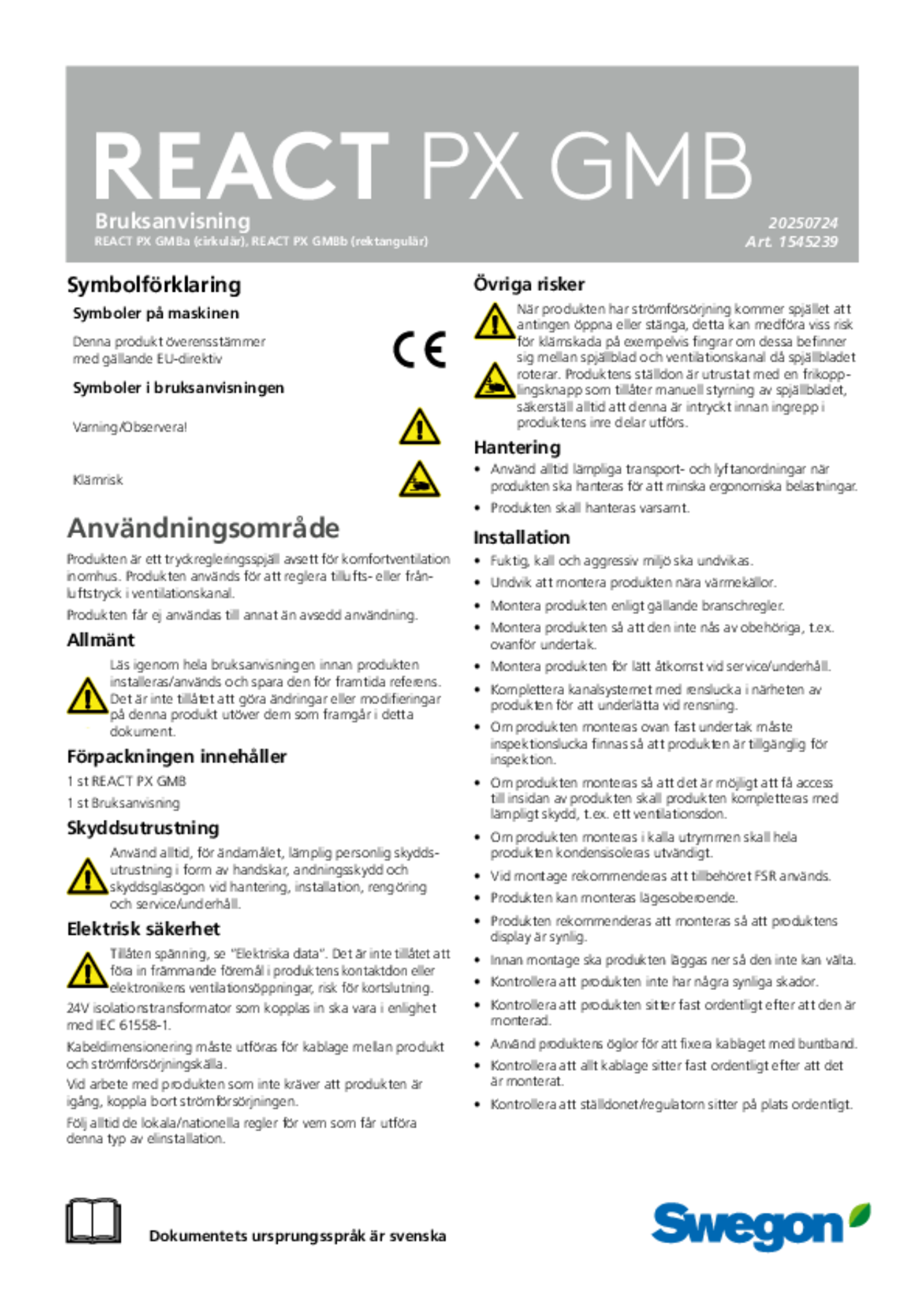 | Bruksanvisning (pdf 2.8MB) | REACT PX-SR GMBa | IOM-manual | |