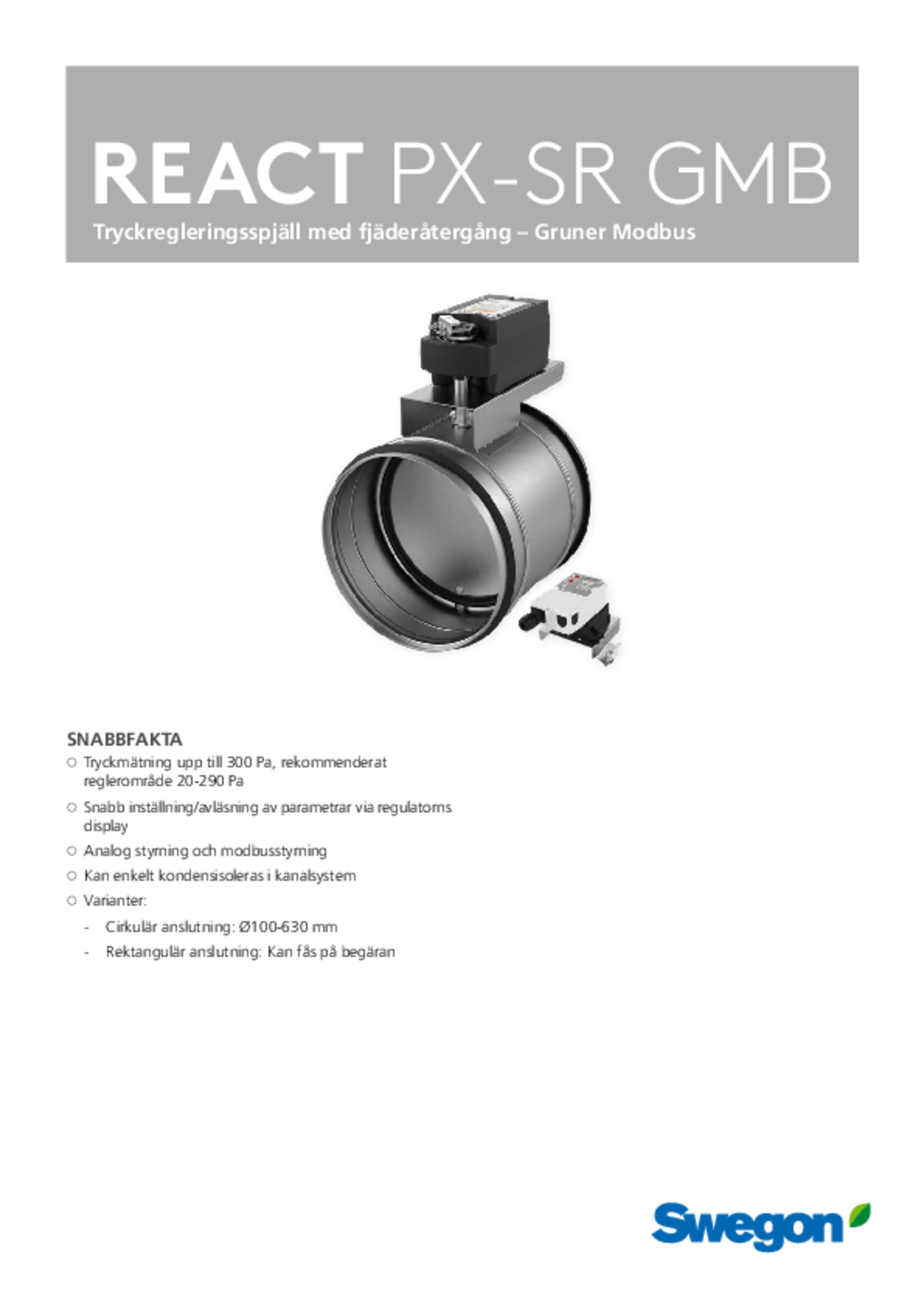 | Tryckregleringsspjäll med fjäderåtergång – Gruner Modbus (pdf 1.33MB) | REACT PX-SR GMBa | Teknisk katalog | |