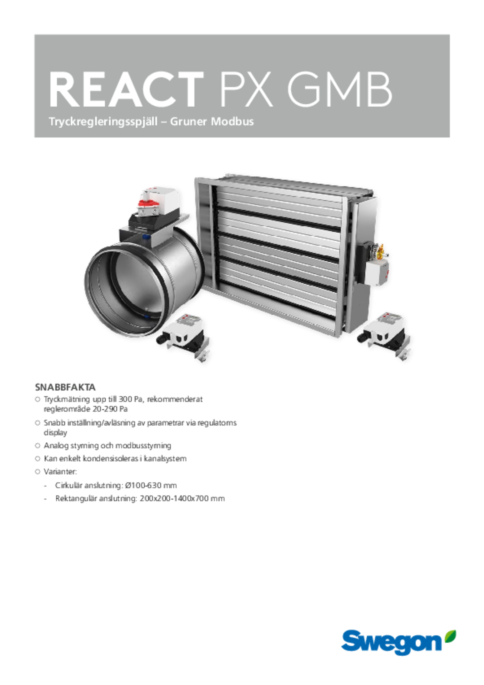 | Tryckregleringsspjäll – Gruner Modbus (pdf 1.83MB) | REACT PX GMBa (cirkulär), REACT PX GMBb (rektangulär) | Teknisk katalog | |