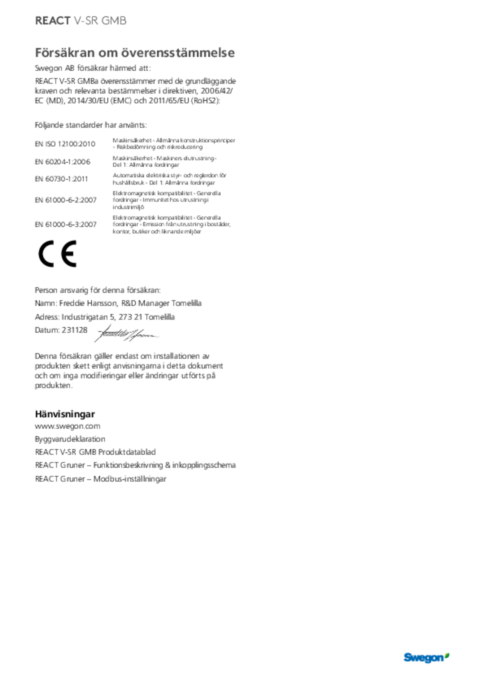 | CE-deklaration (pdf 46.59kB) | REACT V-SR GMBa | Kvalitetsdokument | |