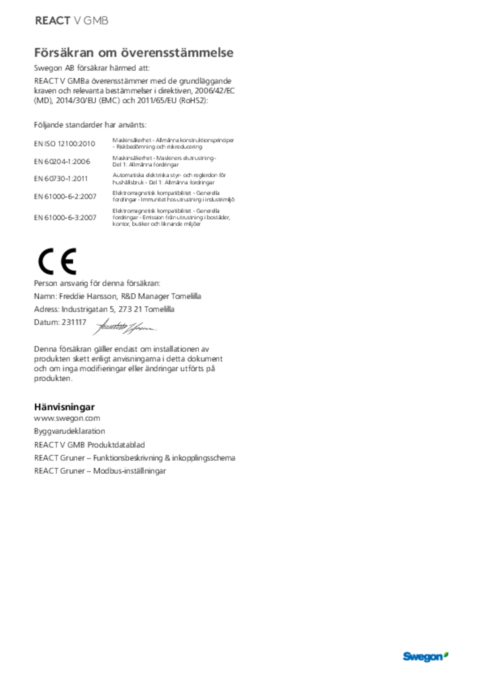 | CE-deklaration (pdf 56.44kB) | REACT V GMBa | Kvalitetsdokument | |