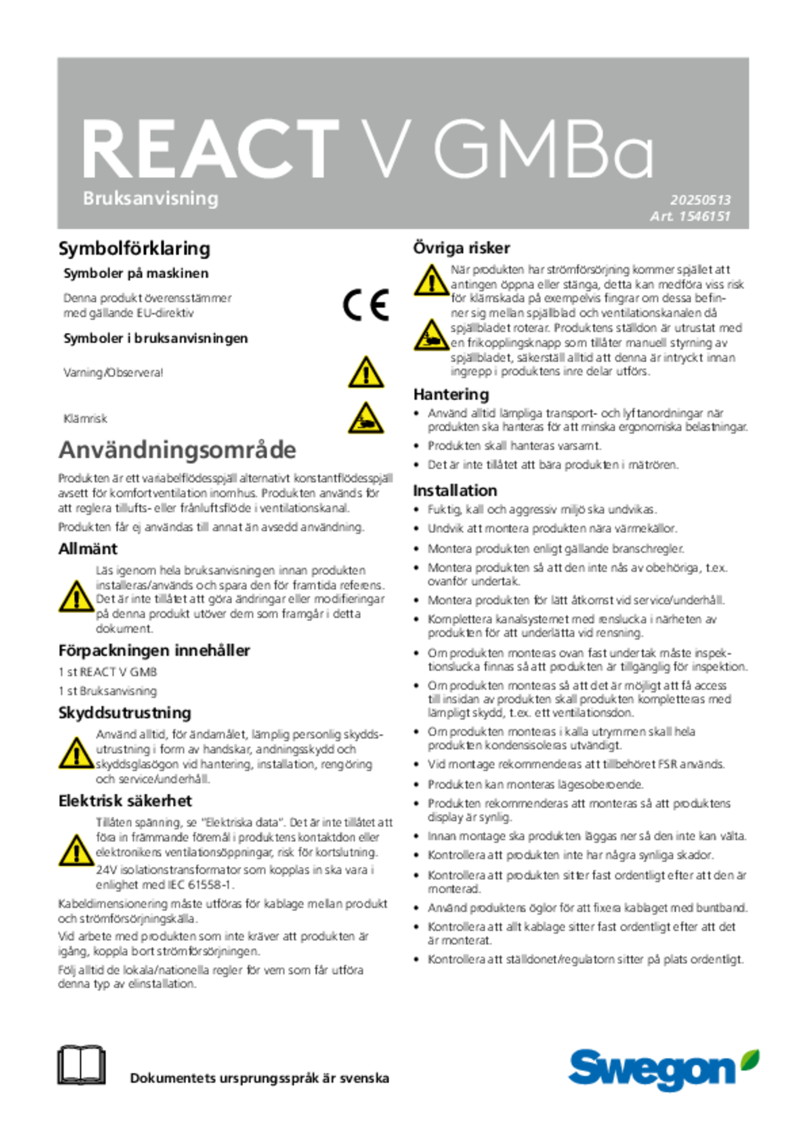 | Bruksanvisning (pdf 1.76MB) | REACT V GMBa | IOM-manual | |
