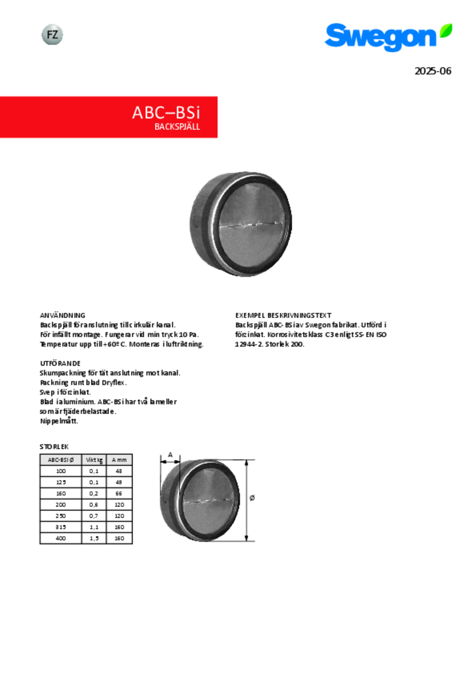 ABC-BSI är ett backspjäll för anslutning till cirkulär kanal. För infällt montage.