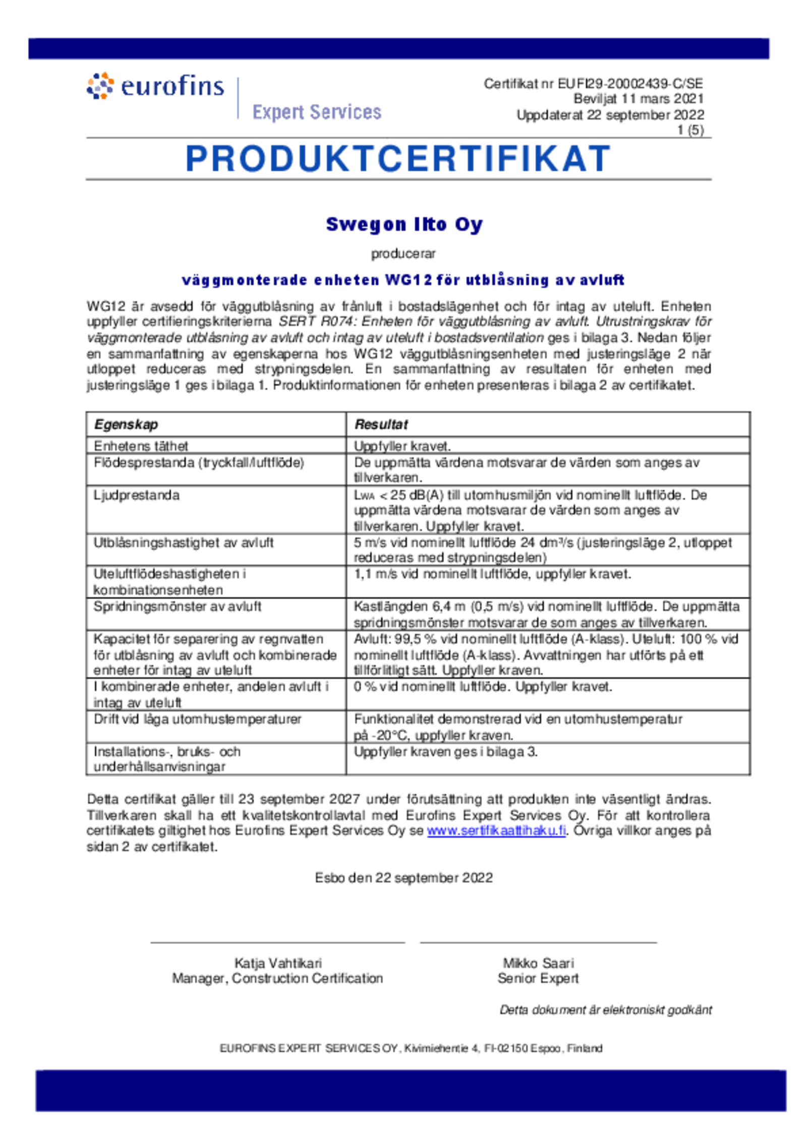 - Minsta tryckförlust vid utblåsningshastigheten 5 m/s