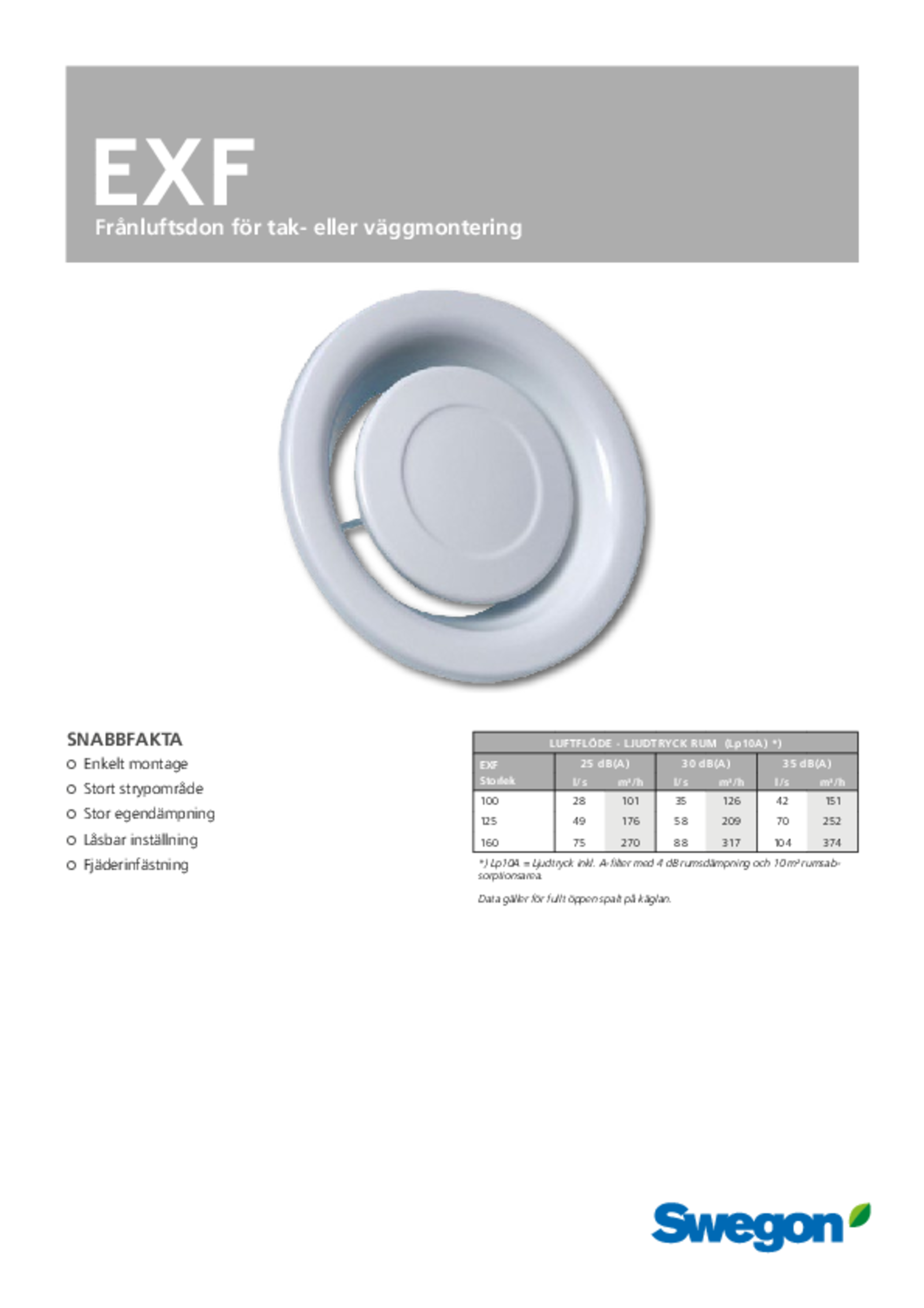 Swegons frånluftsdon typ EXF, med följande funktioner: