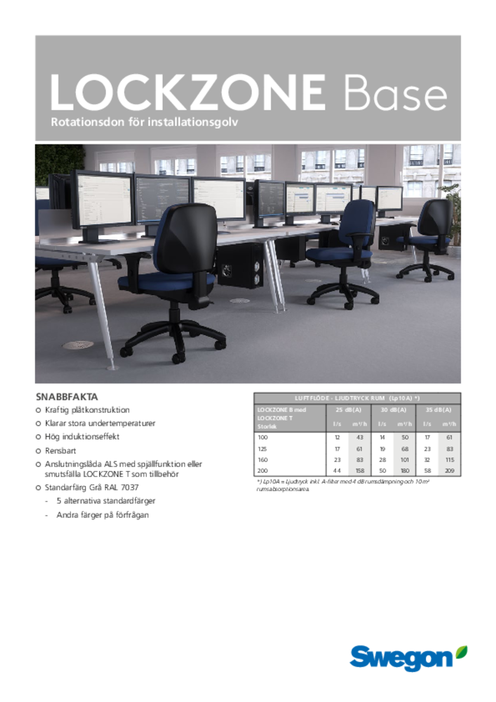 Swegons cirkulära låghastighetsdon för montage i installationsgolv, typ LOCKZONE B, med följande funktioner: