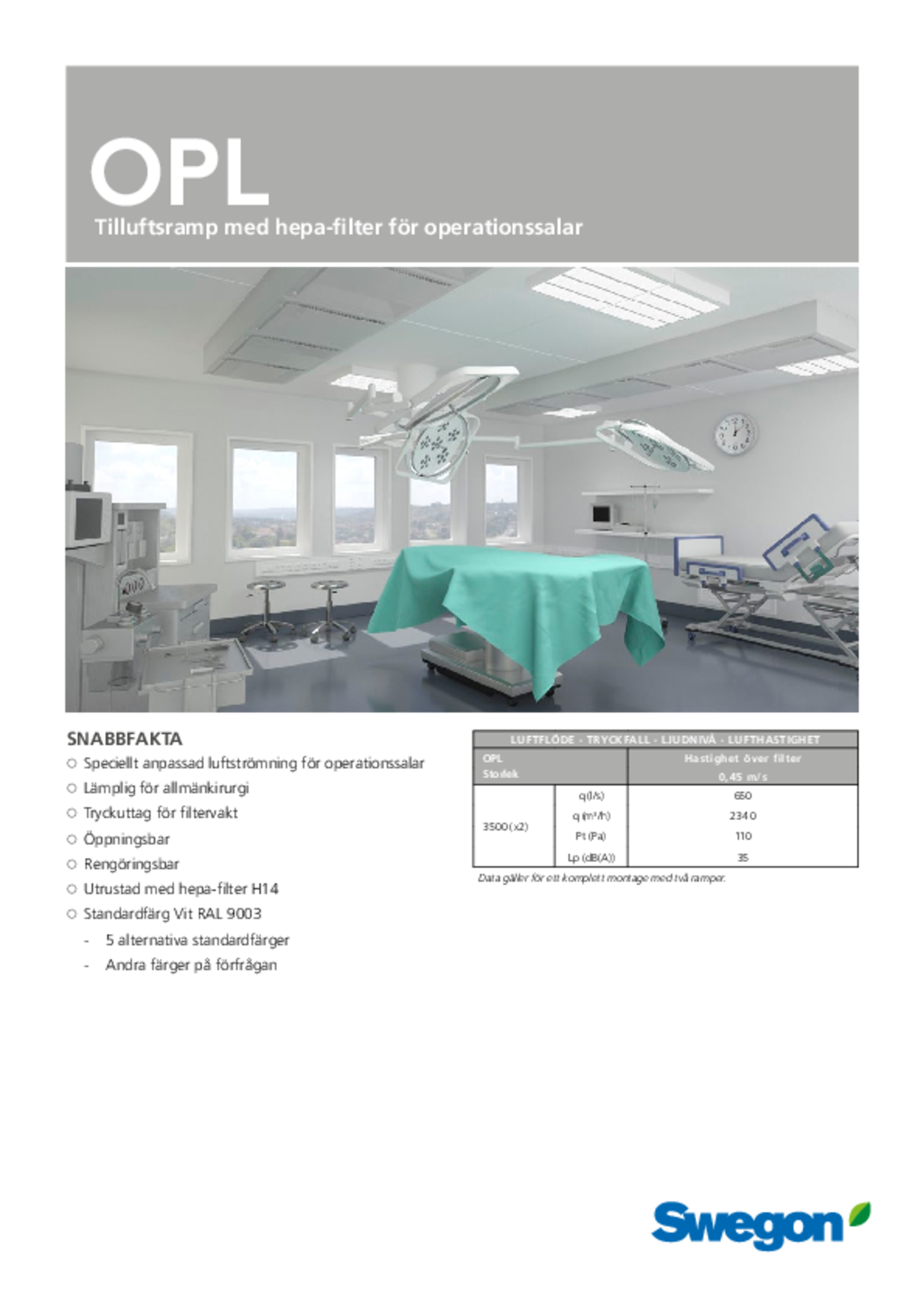 OPL är en tilluftsramp med fem perforerade luftdonsdelar och två HEPA-filter. Ramperna är specialkonstruerade för ventilation av operationssalar och monteras parvis i taket. Panelernas placering till varandra och de olika flödesriktningarna från luftdonsdelarna säkerställer en ren zon med filtrerad luft tillsammans med låg lufthastighet i området närmast patienten. Rampen används med konstant luftflöde och konstant undertemperatur och arbetar utan induktion av förorenad rumsluft.