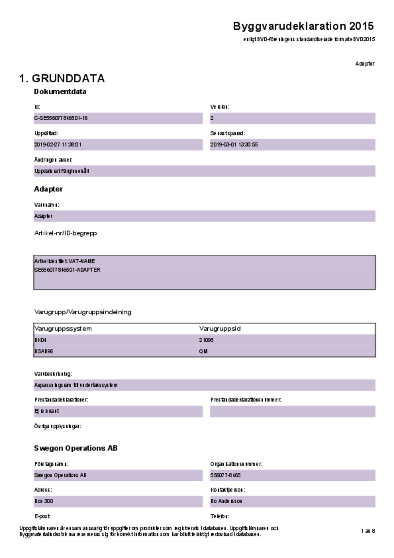 | Byggvarudeklaration (pdf 133.01kB) | ADAPTER | Kvalitetsdokument | |