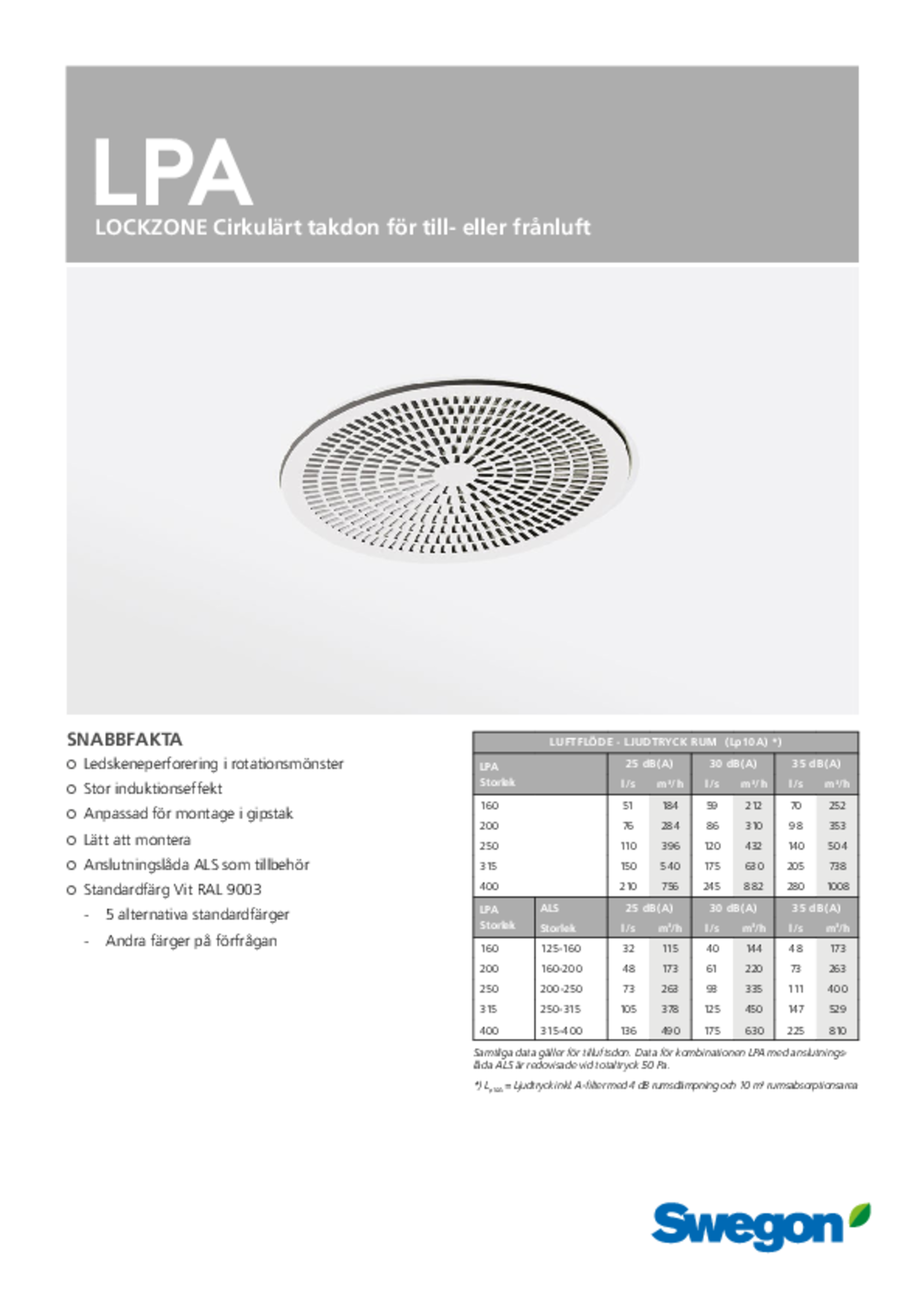 | Samtliga data gäller för tilluftsdon. Data för kombinationen LPA med anslutningslåda ALS är redovisade vid totaltryck 50 Pa. *) Lp10A = Ljudtryck inkl. A-filter med 4 dB rumsdämpning och 10 m² rumsabsorptionsarea. | |||||||
