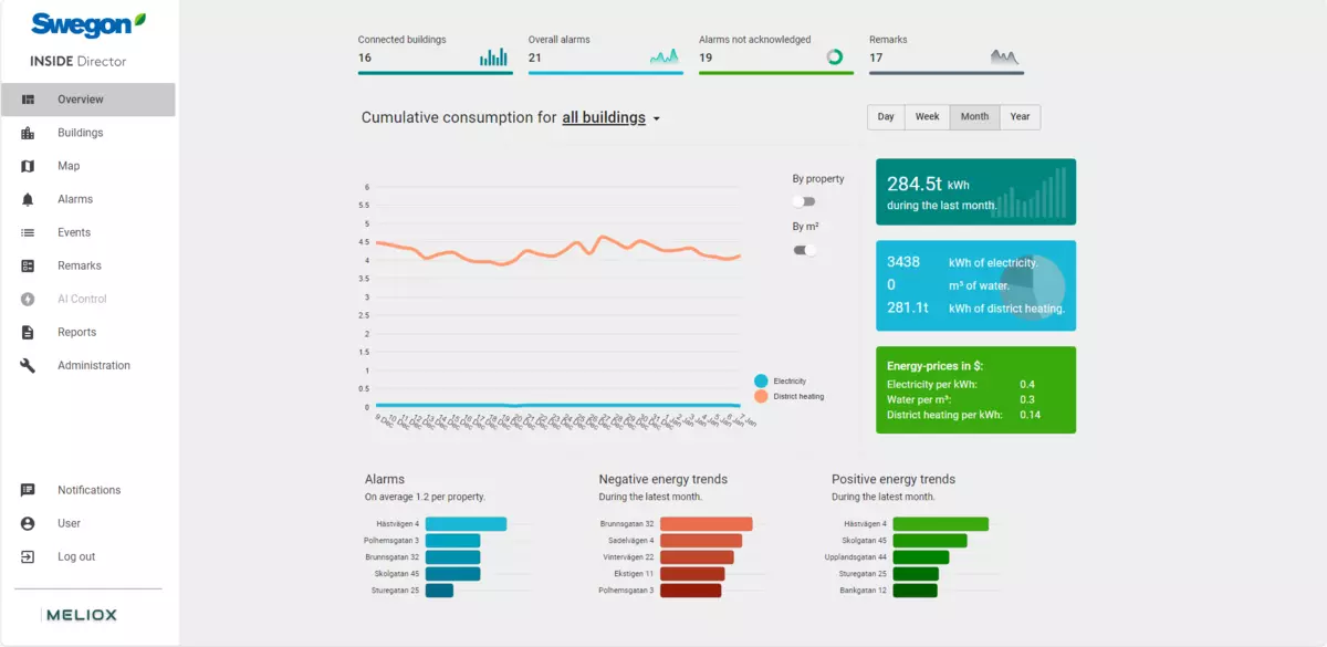 För att kunna hantera en hållbar och effektiv byggnad krävs en smart överblick över och förståelse av energiförbrukningsmönster över tid. I INSIDE Director kan användaren se energistatistik för hela beståndet per byggnad, per byggnad och kvadratmeter, per dygn, vecka, månad eller år.
