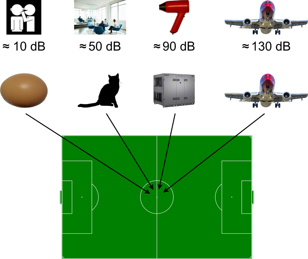 Trycket från de olika föremålen på fotbollsplanen visar att skillnaden är stor för de olika ljudnivåerna. Det skulle vara svårt att förstå skalan om man inte använde decibel.