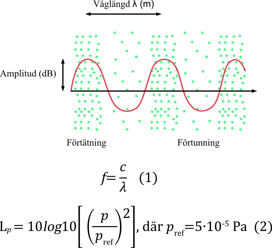 När du höjer volymen när du lyssnar på musik ökar ljudstyrkan och ljudvågorna blir högre. Höjden på ljudvågorna kallas amplitud (ljudtryck). Ljudtrycket [ (Pa)] varierar mycket och därför redovisas ljudnivåer (Lp) i dB, beräkningen görs enligt ekvation 2. Decibel är en logaritmisk skala som gör att det blir enklare att förstå.