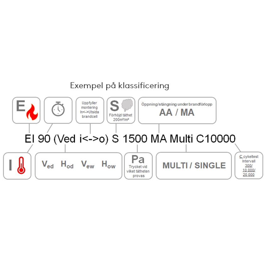 EyyxxS = krav på integritet och förhöjd brandgastäthet uppfyllda under angiven tid i minuter (xx) uppfyllt upp till angiven temperatur (yy)​